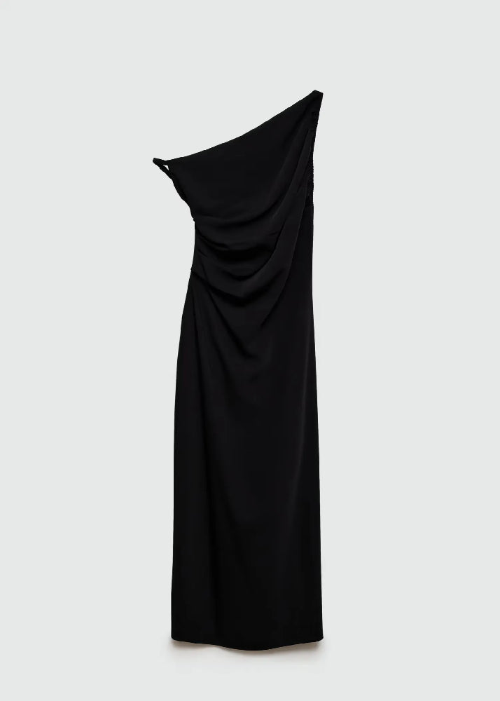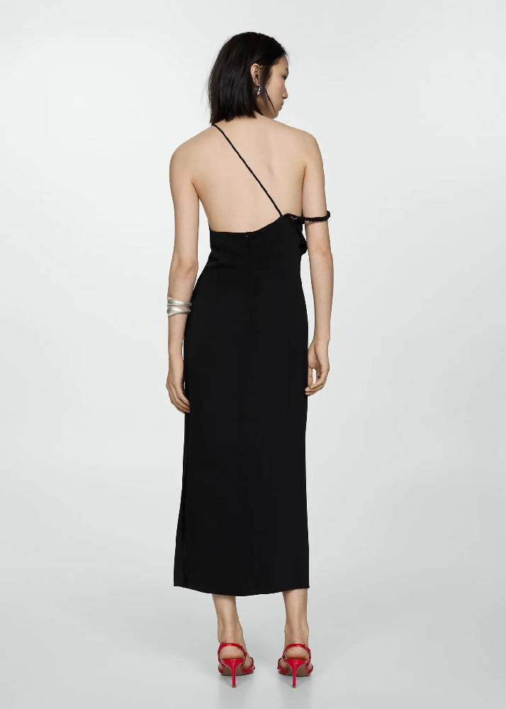 Fluid fabric. Midi design. Asymmetric neckline. Sleeveless. Thin Straps. Invisible back zip fastening. Draped detail.