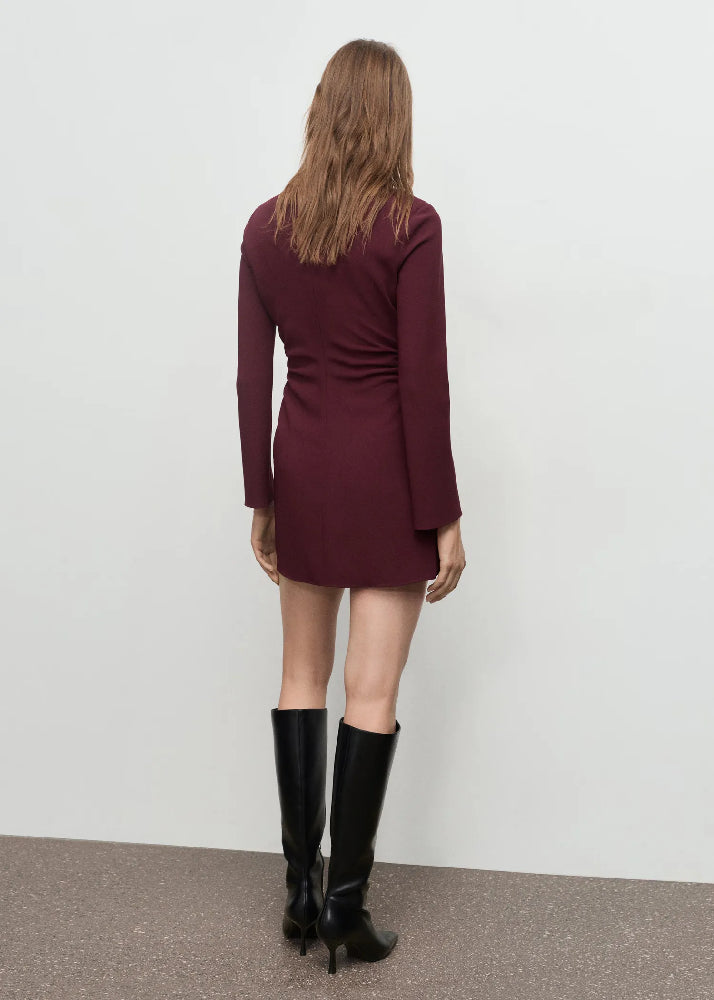 Short Design. Fitted design. Boat neck. Long sleeve. Side pleats.