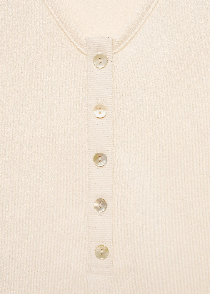 Knit fabric. V-neck. Wide straps. Decorative buttons. Press stud fastening on the lower section. Fitted design.
