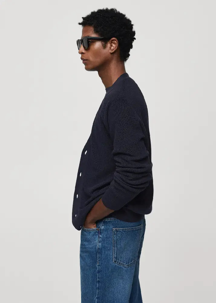 Made to last. The light grey model is an online exclusive. Fine-knit fabric. Cable knit design. V-neck. Long sleeves with elastic cuffs. Straight hem with ribbed ends.