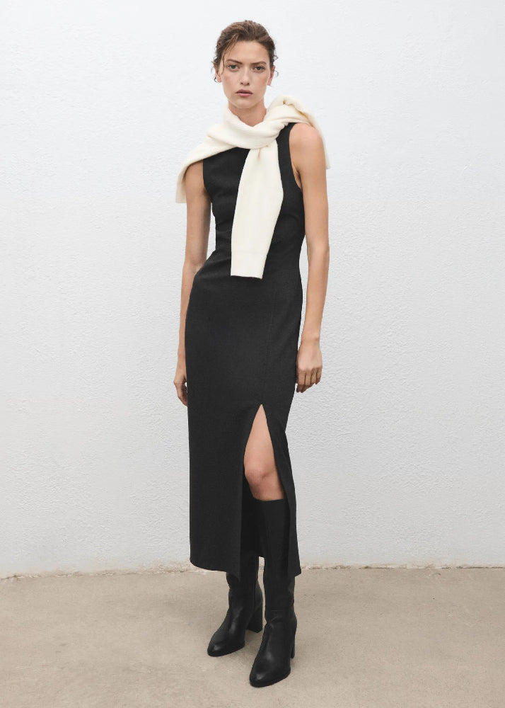 Stretch fabric. Midi design. Fitted design. Round neck. Sleeveless. Wide straps. Side ruffles. Side opening at the hem. No Fastening.
