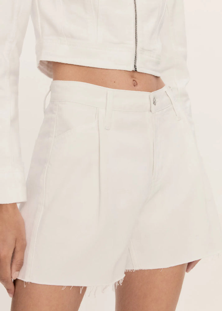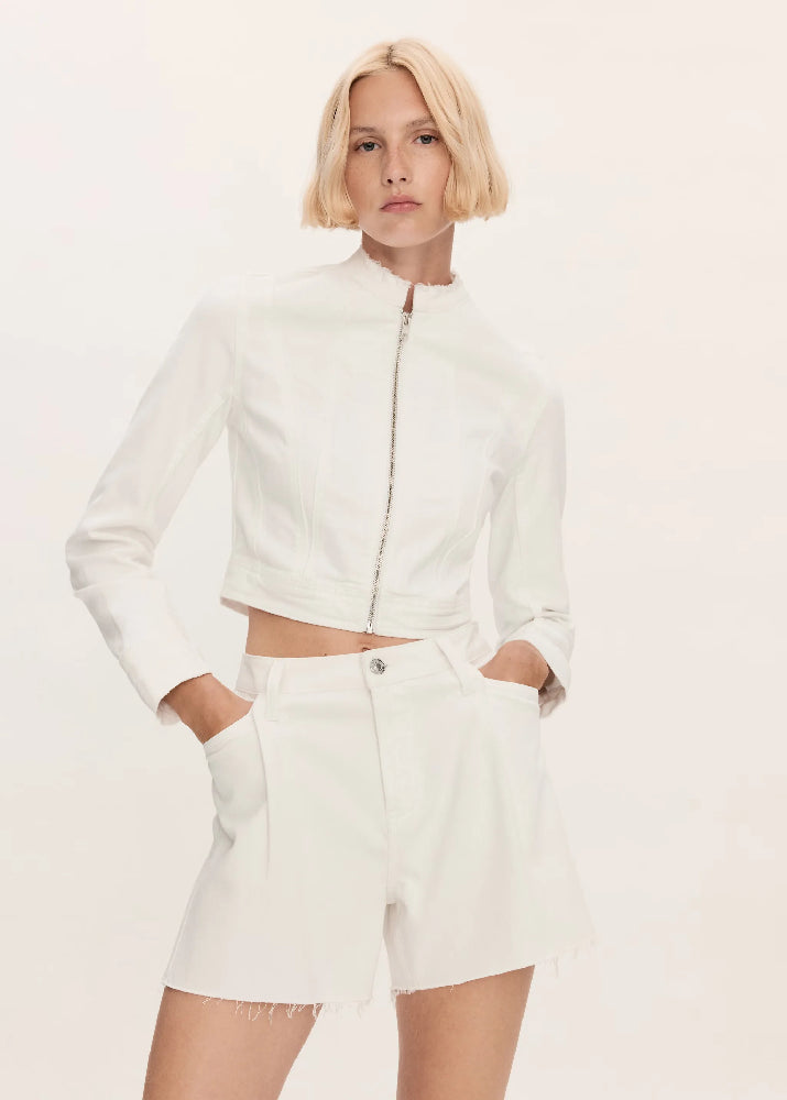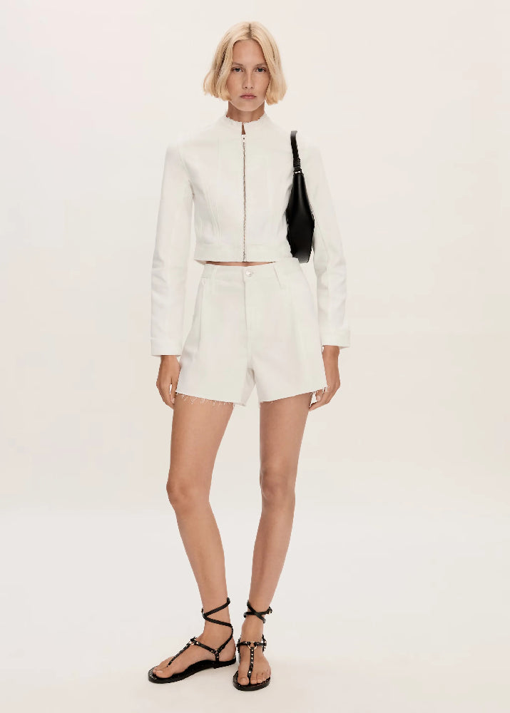 Denim-style cotton fabric. Straight Design. Short design. Two front pockets. Two patch pockets at the back. Belt loops. Dart detail. Frayed hem. Front zip and button closure