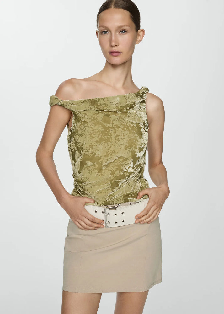 Fluid fabric. Velvet details. Draped details. Draped neckline.