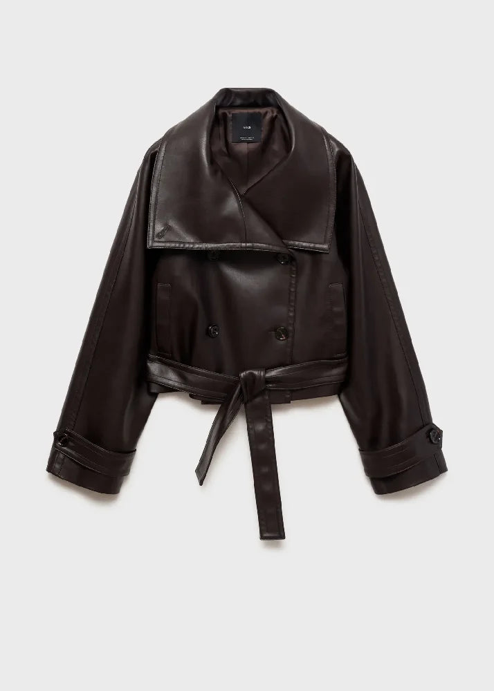 Faux leather. Straight design. Short design. Crossover collar with lapel.