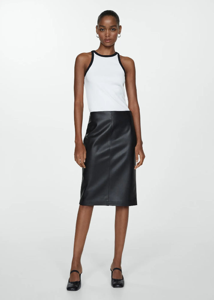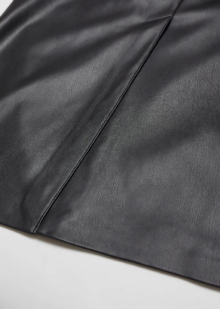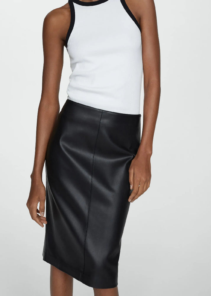 Faux leather. Midi design. Straight design. Invisible back zip fastening. Back slit