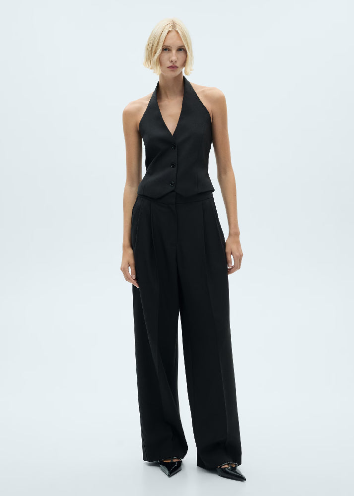 Crop design. V-neck. Halter neck. Open back. Button fastening at the front. Inner lining. Total look. Party and Ceremony Collection.
