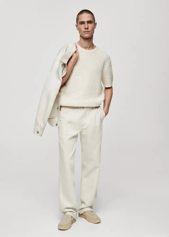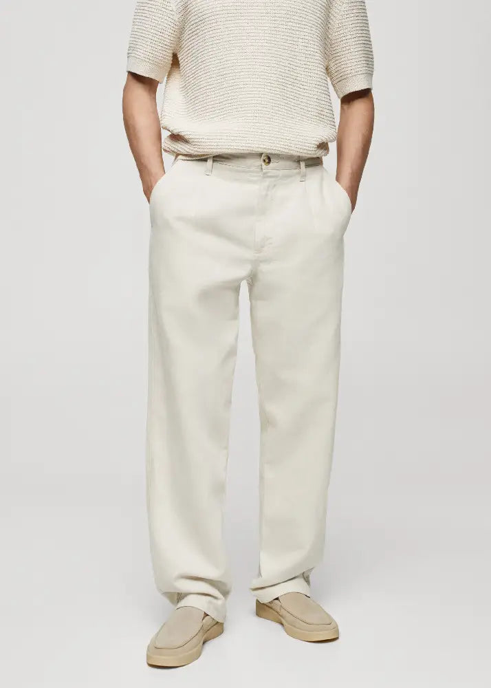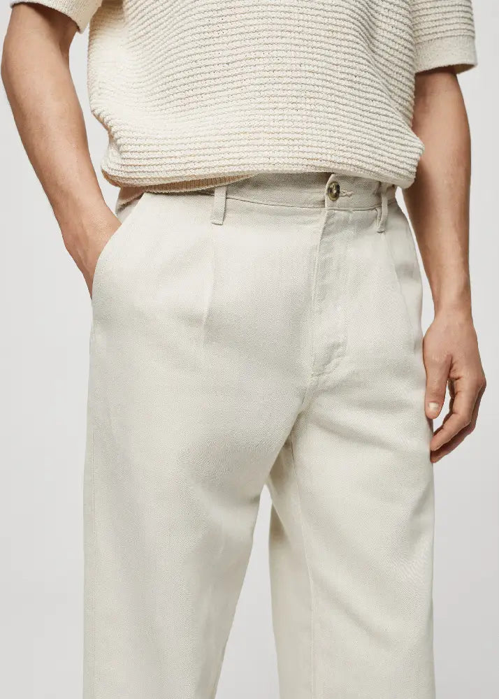 Cotton and linen blend fabric. Mid-rise. Front fastening with double-breasted buttons and zip. Belt loops. Front pleat detail. Two front pockets. Two pockets with buttoned flaps on the back.