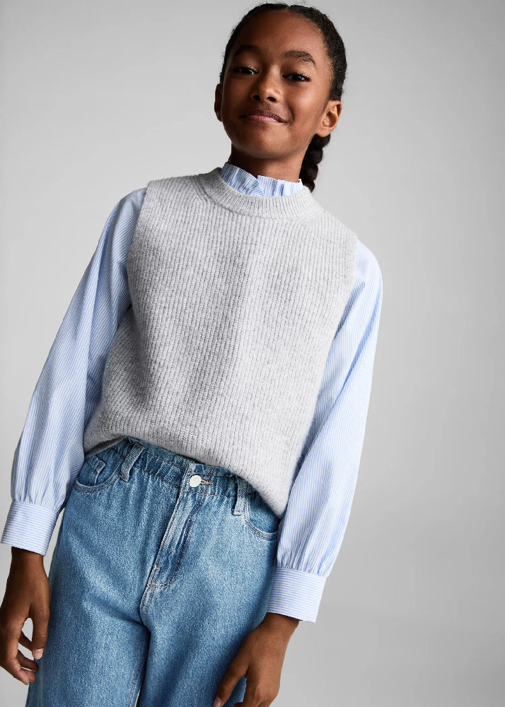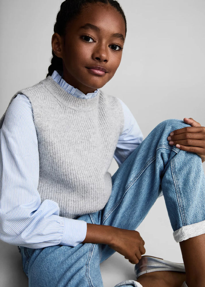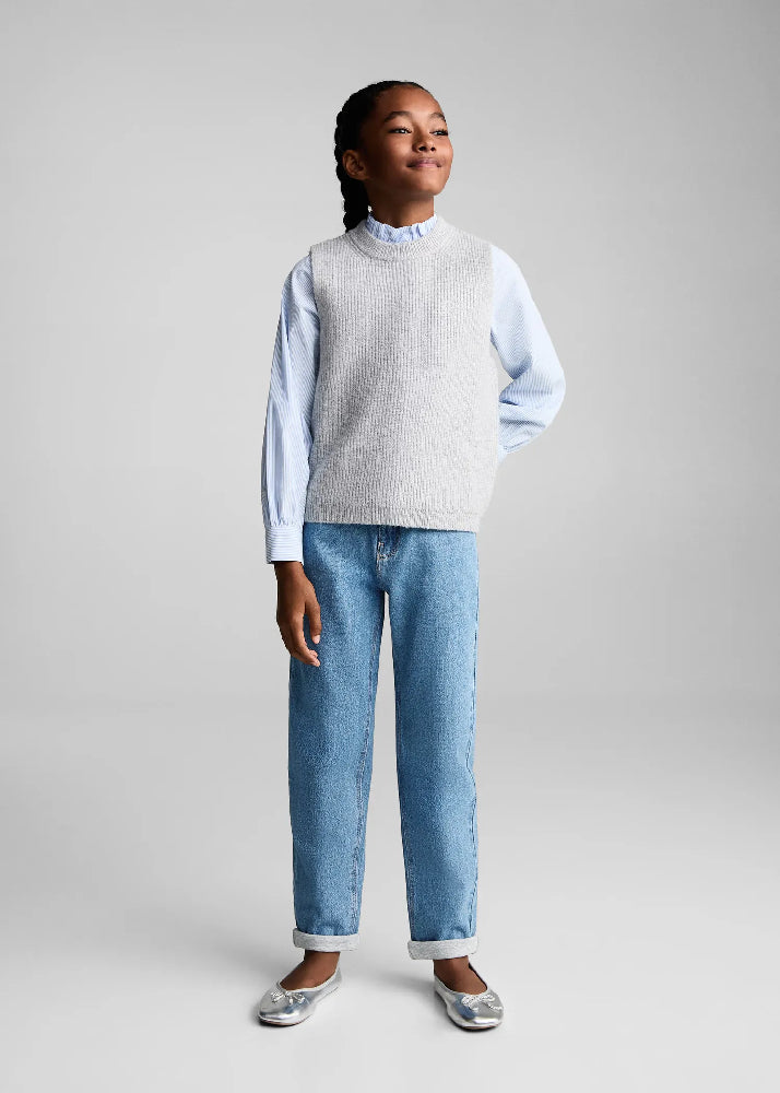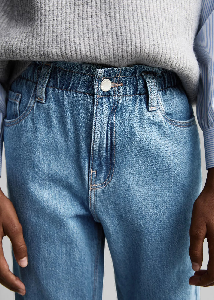 Denim-style cotton fabric. Straight Design. Elastic paperbag waistband. Long design. Five pockets. Inner lining. Zip and button fastening.