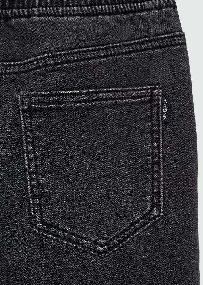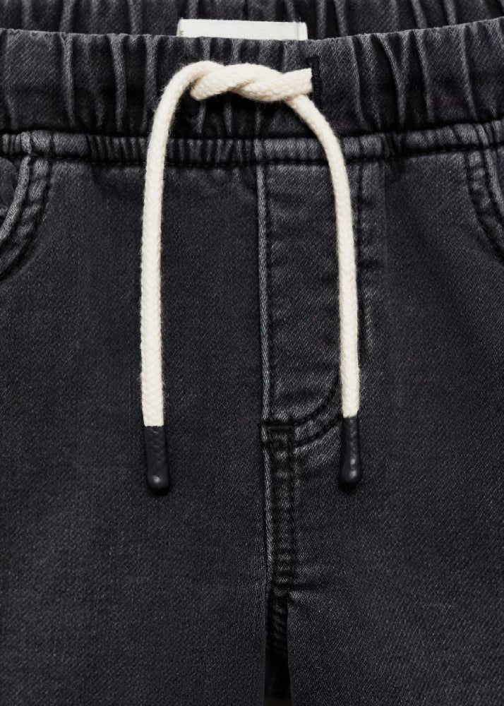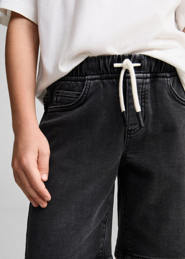 Denim Style Cotton Fabric. Straight Design. Short Design. Elastic Waistband. Five Pockets. Drawstring Closure.