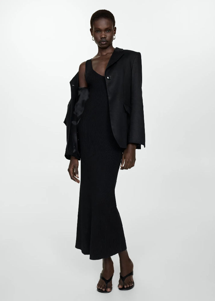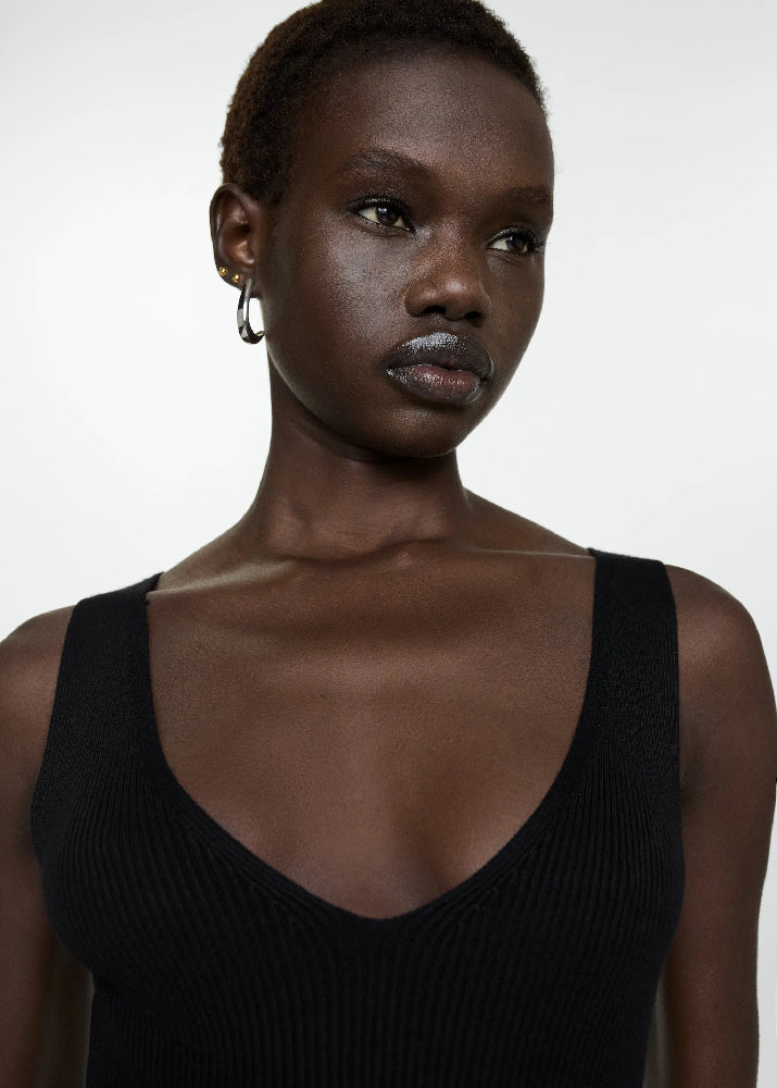 Fine-knit fabric. Midi design. V-neck. Sleeveless. Wide straps. No Fastening. Fitted design.