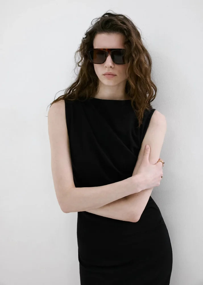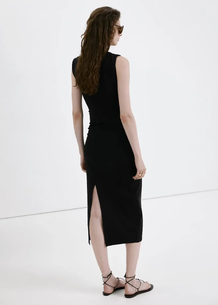 Cotton and modal mix. Long design. Straight design. Draped details. Round neck. Sleeveless. Wide strap. Back slit detail. No Fastening