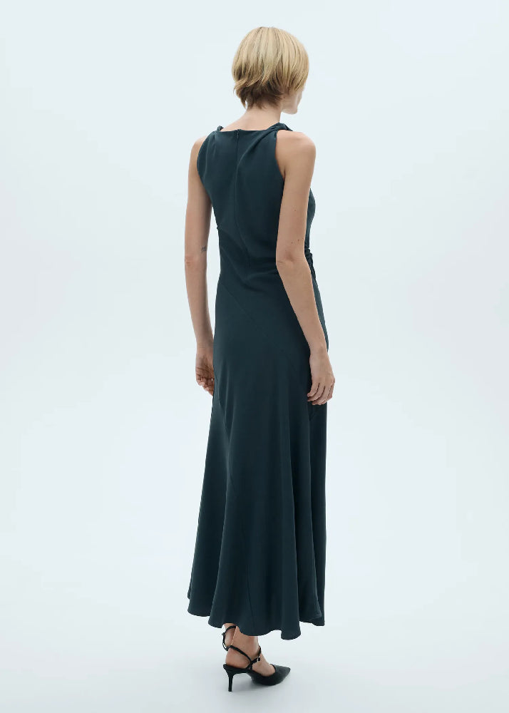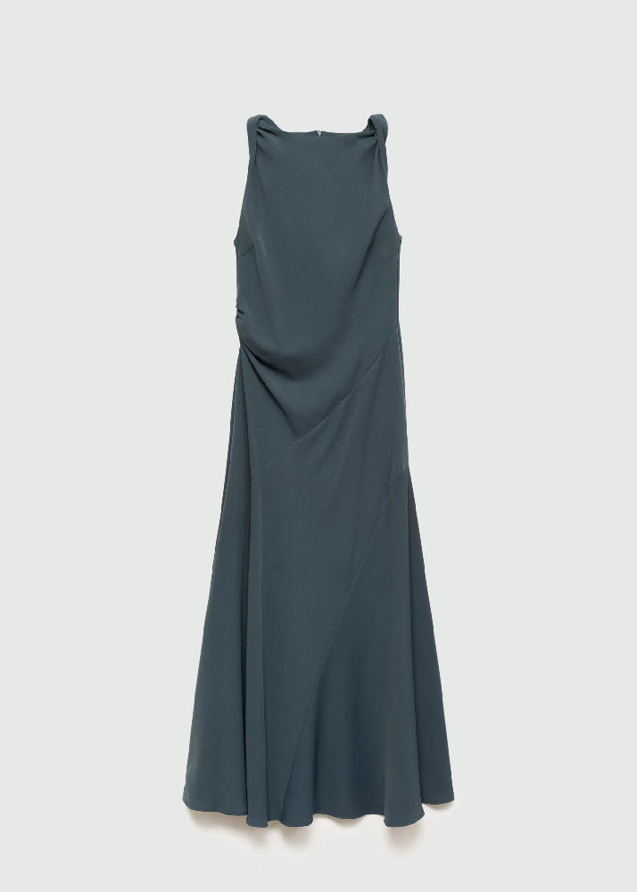 Fluid fabric. Long design. A-line design. Round neck. Sleeveless. Braided straps. Invisible back zip fastening.