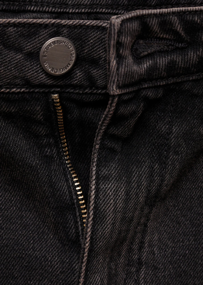Denim-style cotton fabric. Wide-leg design. Long design. Low waist. Loose. Belt loops. Five pockets. Zip and button fastening. Decorative seams