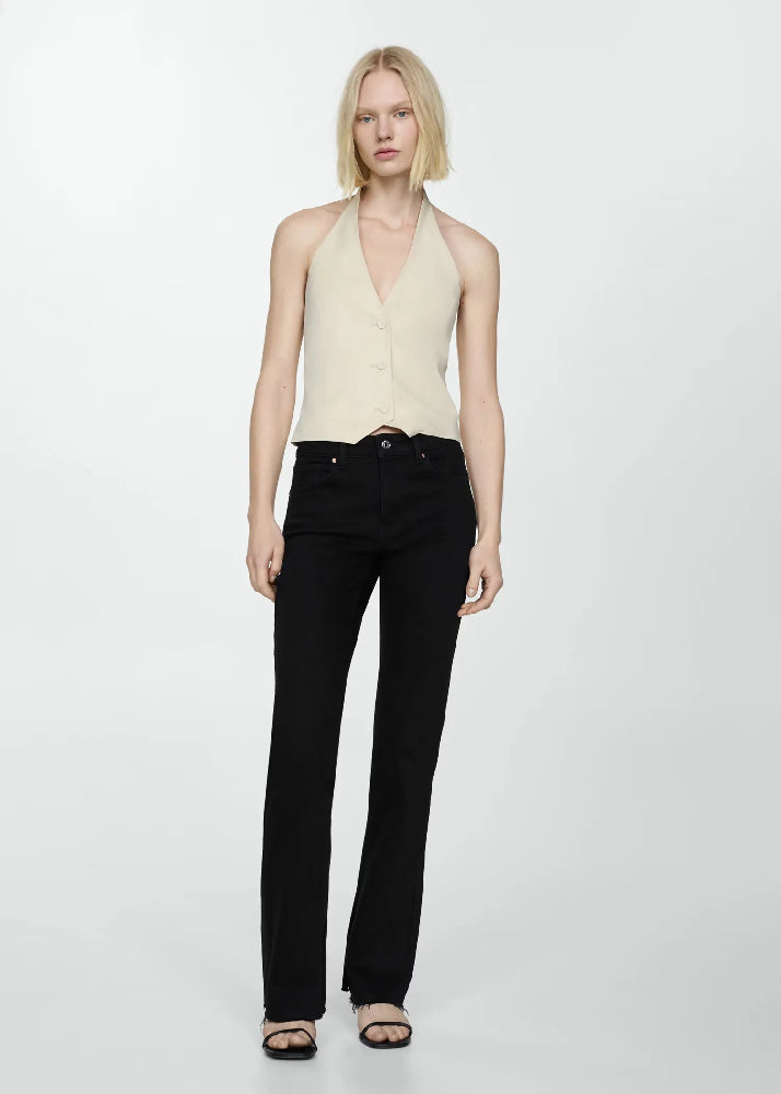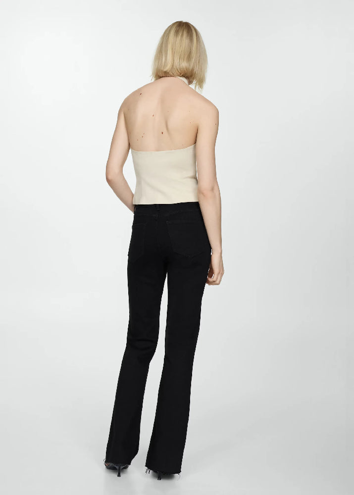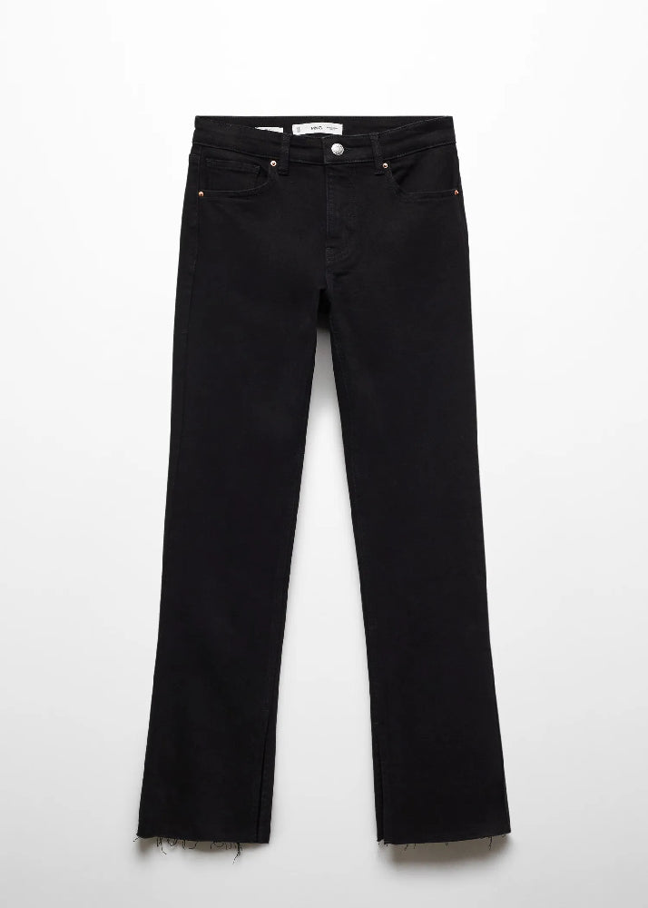 Denim-style cotton fabric. Elastic fabric. Long design. Bell design. Flare design. Medium waist. Two side pockets. Two patch pockets at the back. Zip and button fastening. Frayed hem. Hem slits. Inseam 80 cm. Full length.