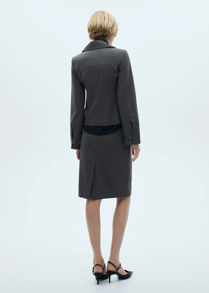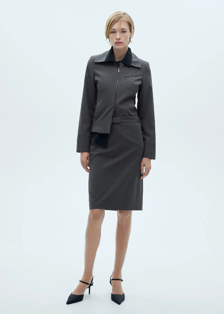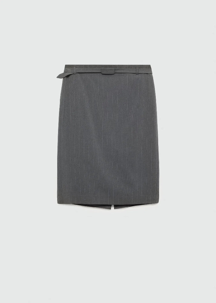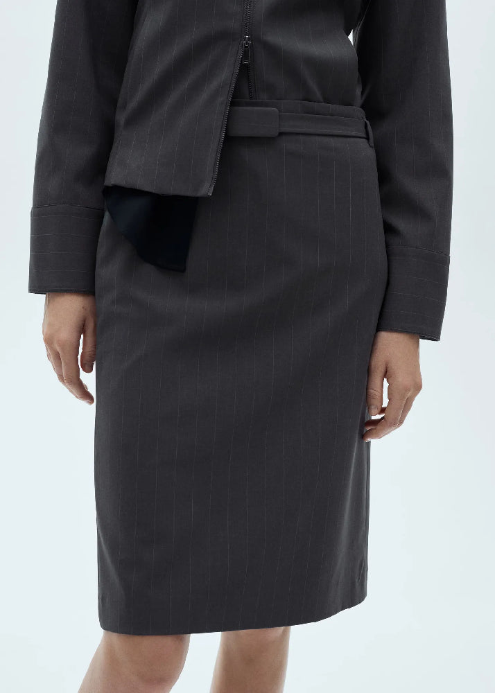 Pinstripe design. Pencil design. Fitted design. Midi design. Removable belt. Opening at the bottom. Inner lining