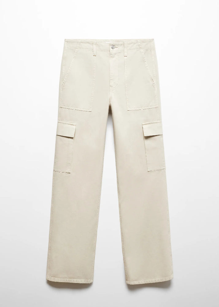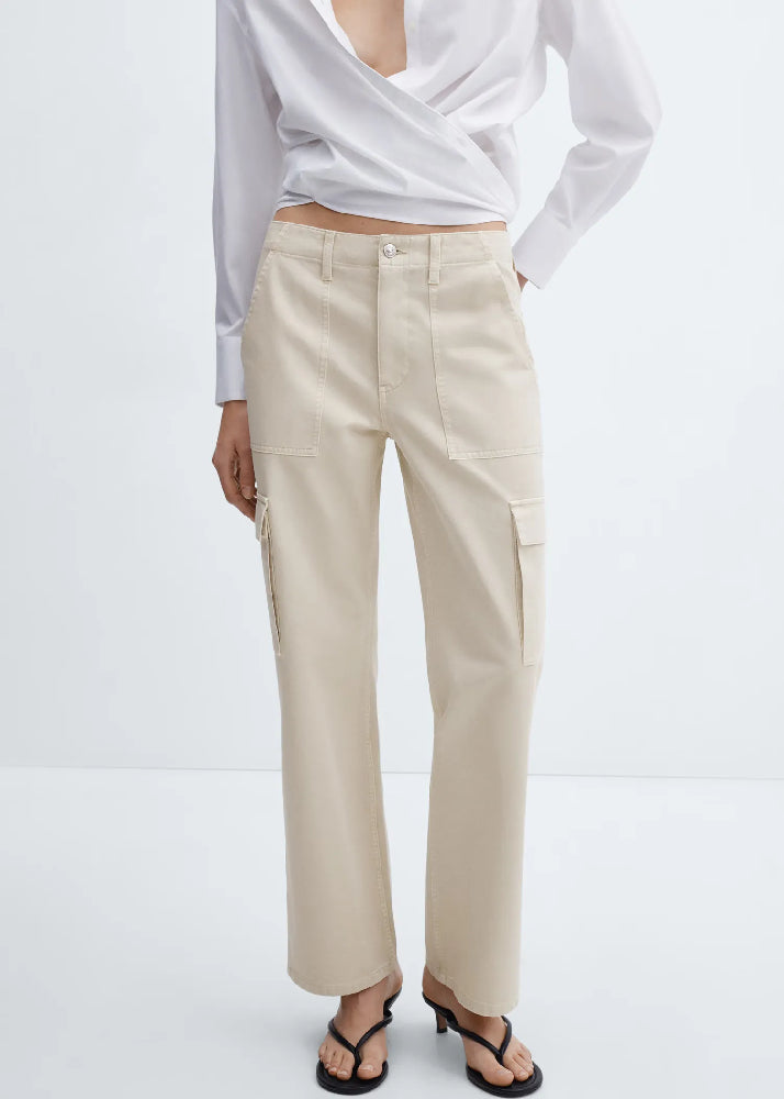 Denim-style cotton fabric. Cargo design. Medium waist. Belt loops