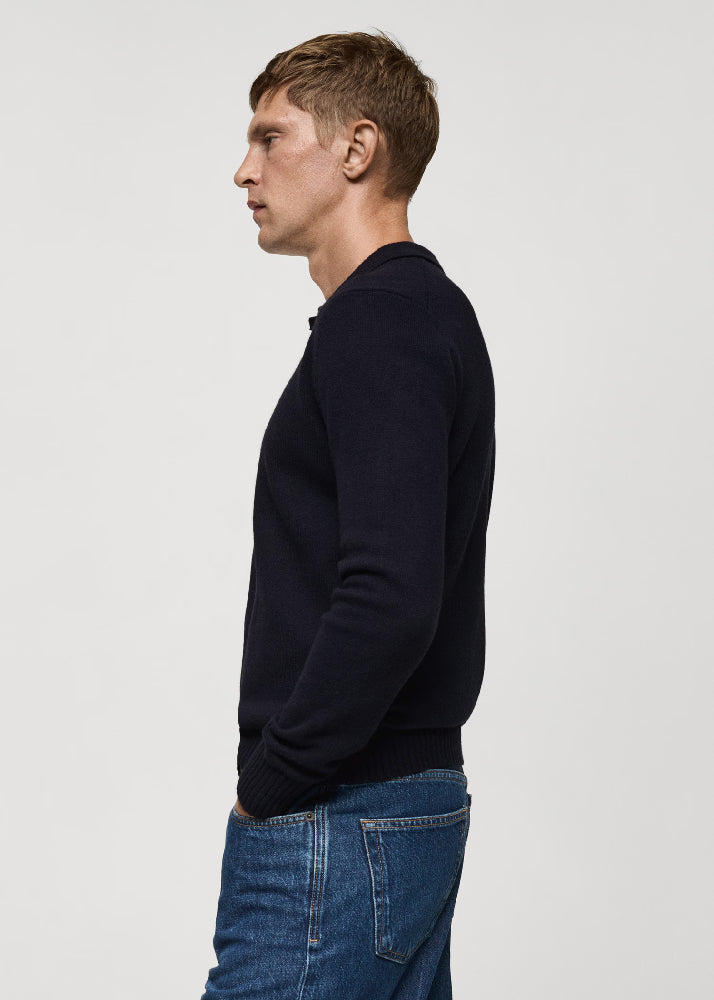 Wool mix fabric. Regular fit. Medium knit fabric. Polo-neck with button closure.