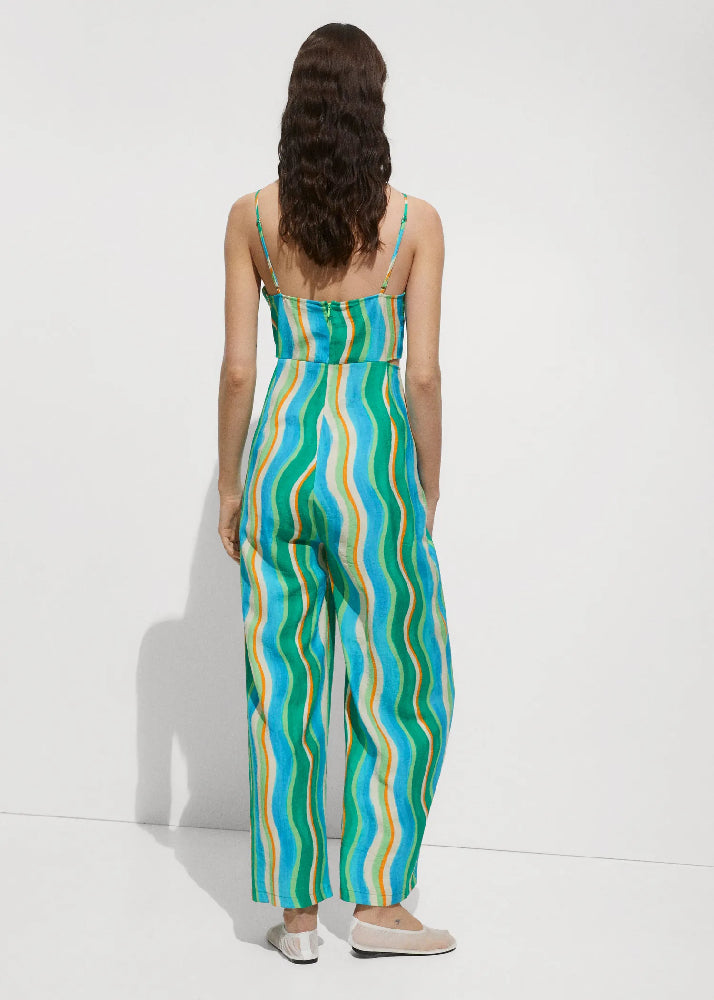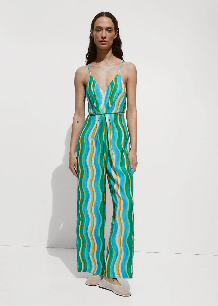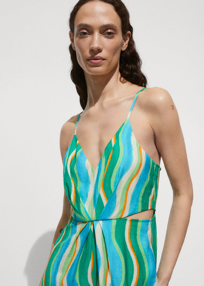 Fluid fabric. Long design. Straight Design. Cut-out. Thin straps. V-neckline. Sleeveless. Invisible back zip fastening. Draped details. Side slits. Festival Season. Printed design