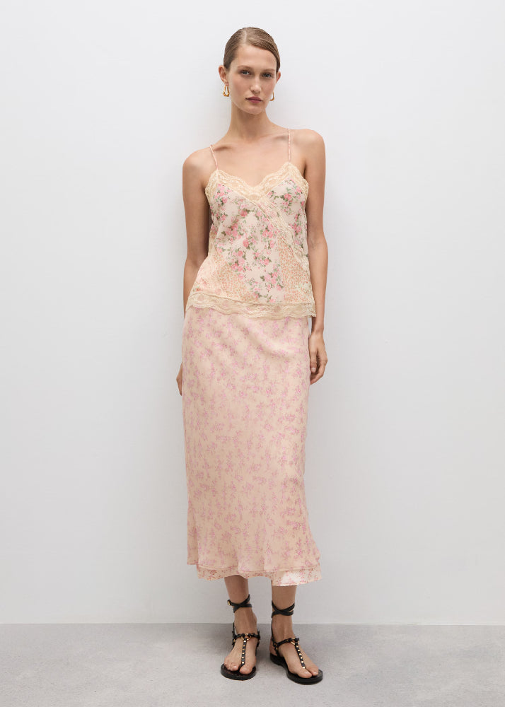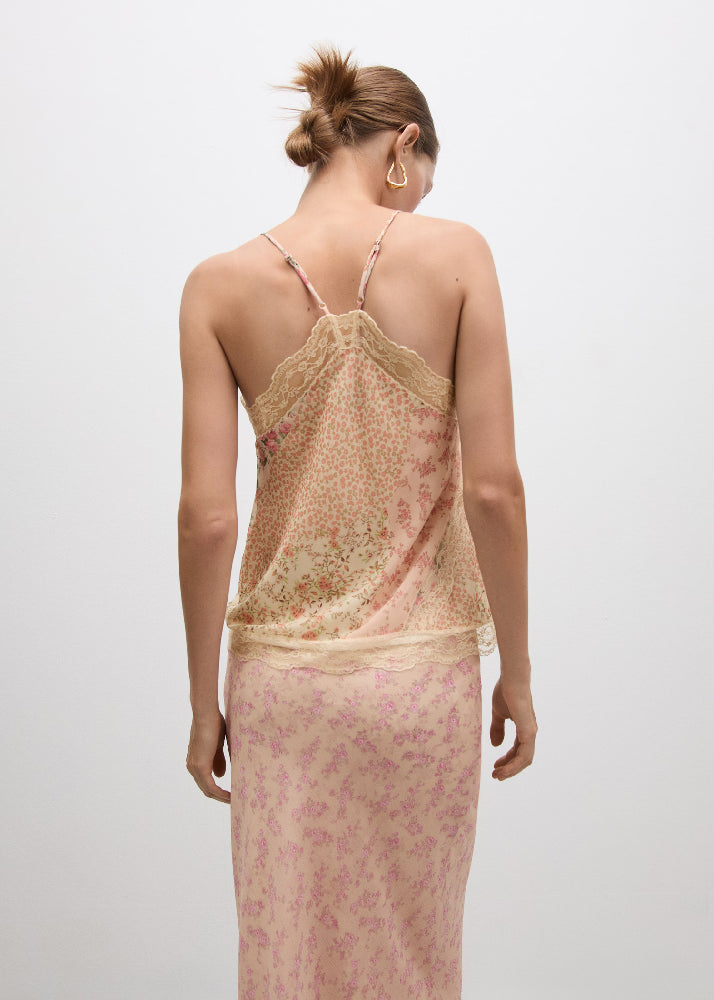 Fluid fabric. Straight Design. Floral print. V-neckline. Sleeveless. Thin straps. Lace finish.