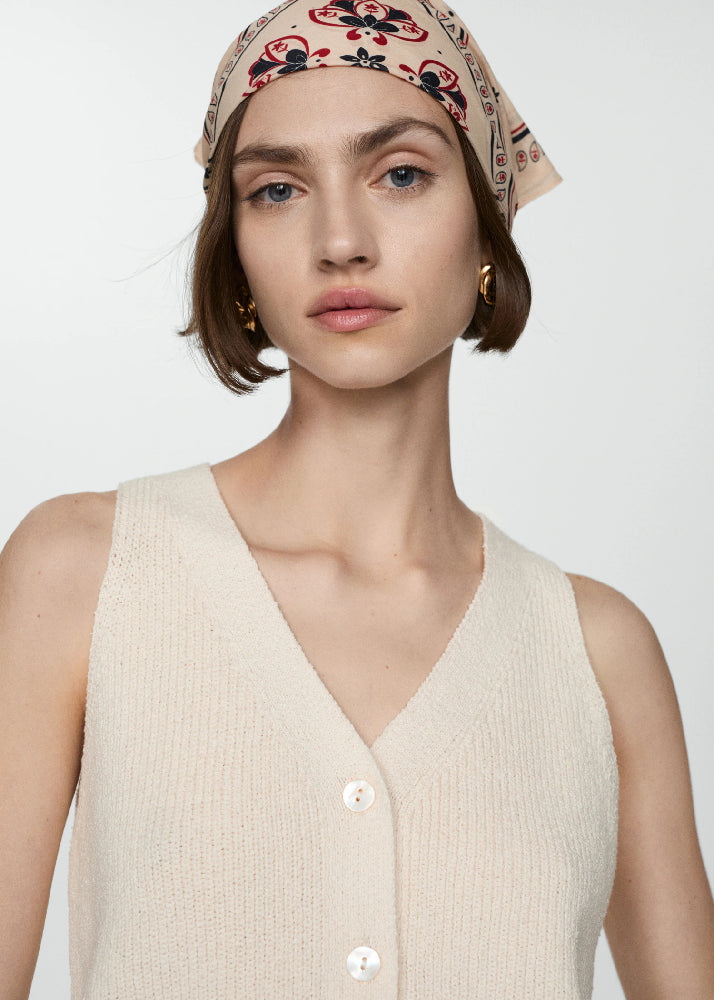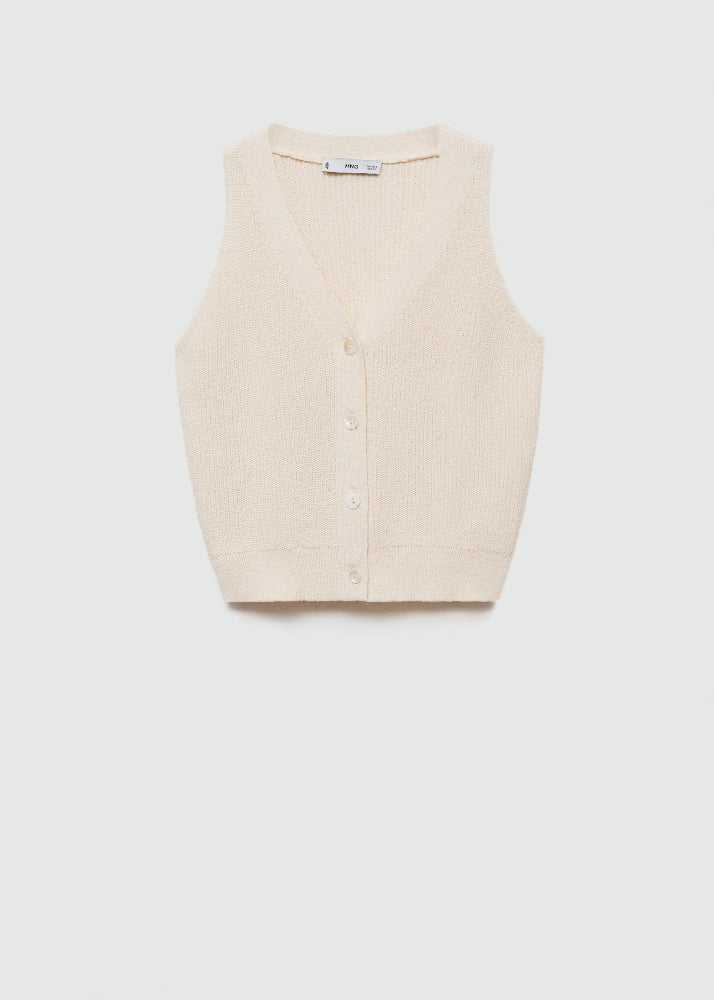 Cotton blend fabric. Cable knit fabric. Midpoint. Straight Design. V-neck. Sleeveless. Front closure with buttons.