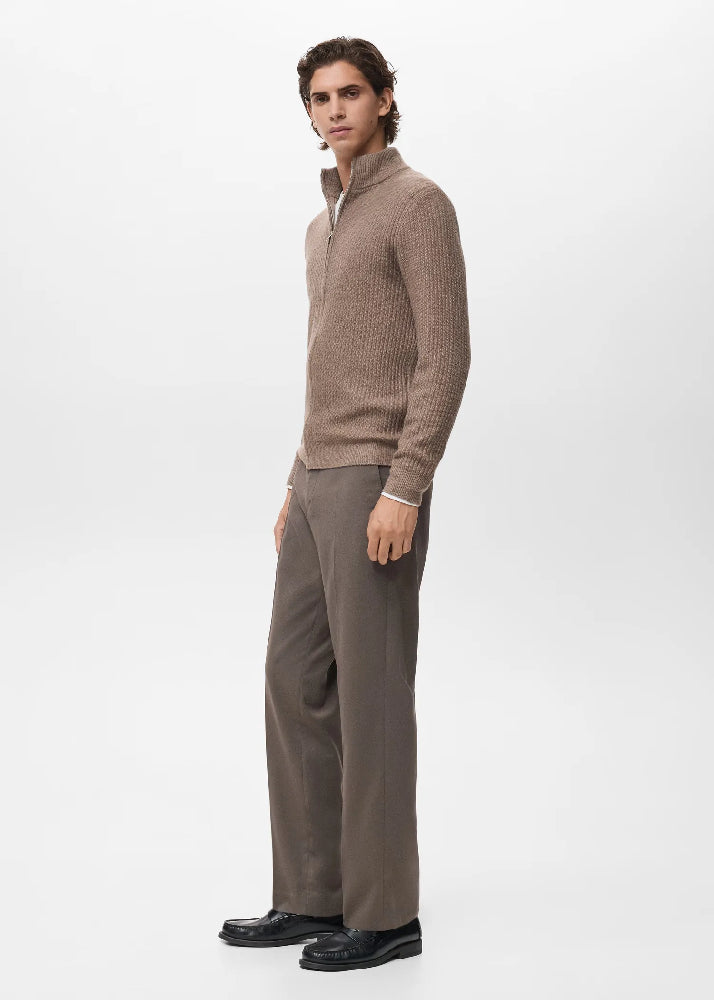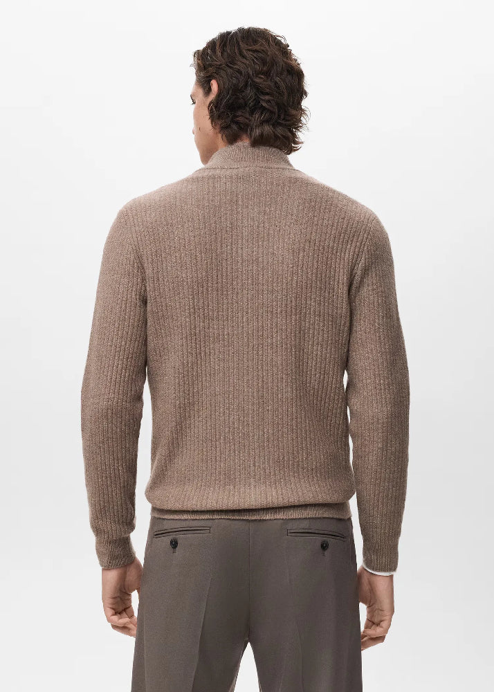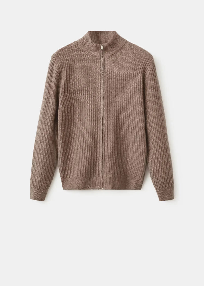 Straight silhouette. Knitted fabric. Cable knit design. High collar. Long sleeves with elastic cuffs. Ribbed finish on the sleeves and hem. Front zip closure.