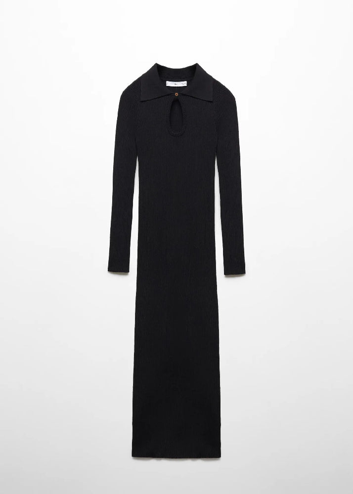 Cable knit fabric. Midi design. Polo collar. Long sleeve