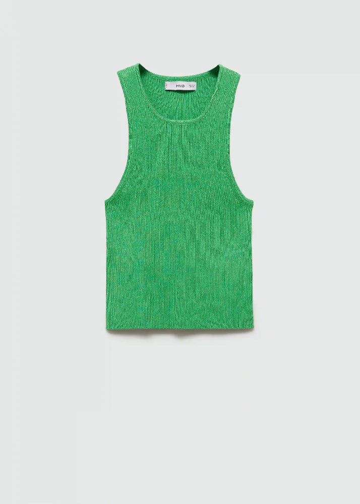 Rib knit fabric. Fine-knit fabric. Crop design. Round neck. Sleeveless. Wide straps.