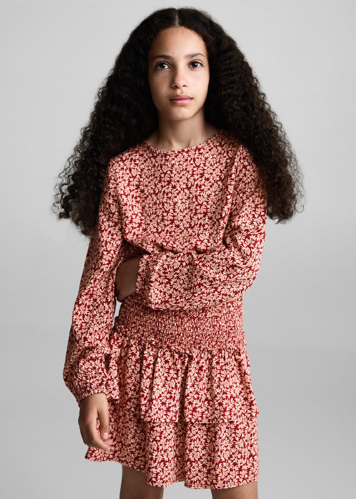 Straight Design. Leaf print. Ruched panel. Round neck. Long sleeve. Elastic finish. Button closure at the back. Printed Design. Viscose fabric.