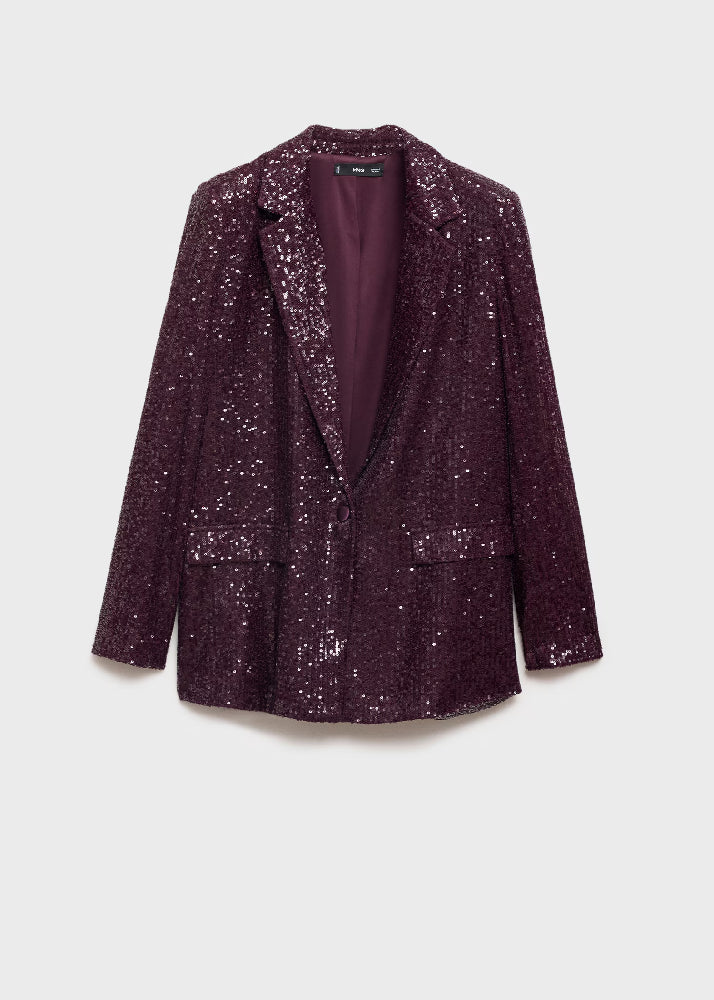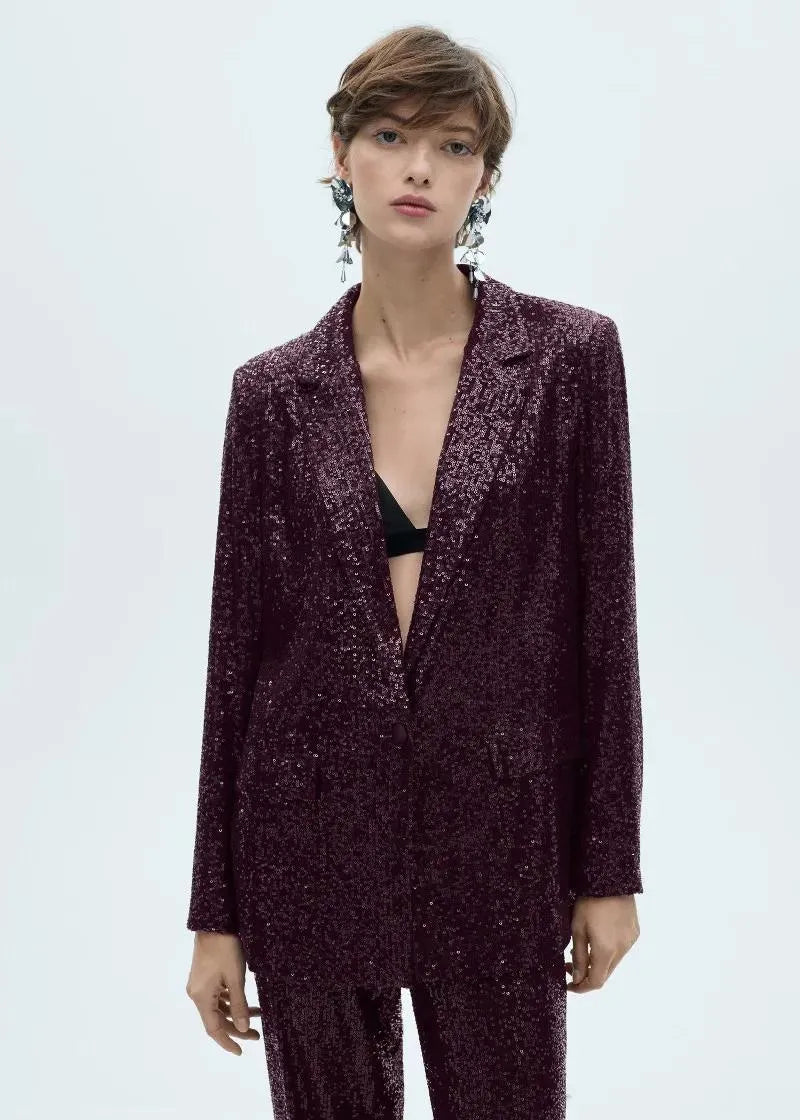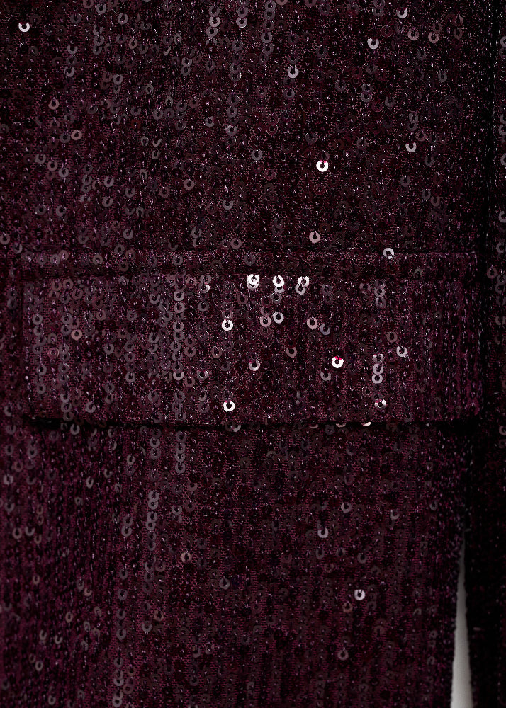 Fabric with sequin. Straight Design. Lapel-collar V-neck collar. Long sleeves. Two front welt and flap pockets. Front button closure. Total look. Party and Ceremony Collection.