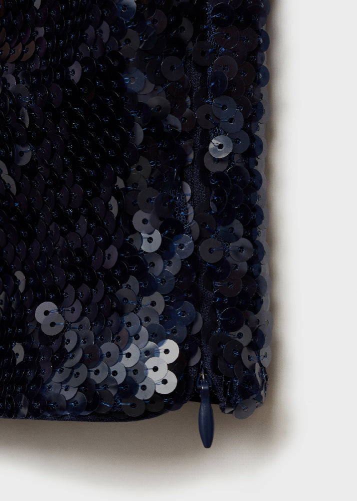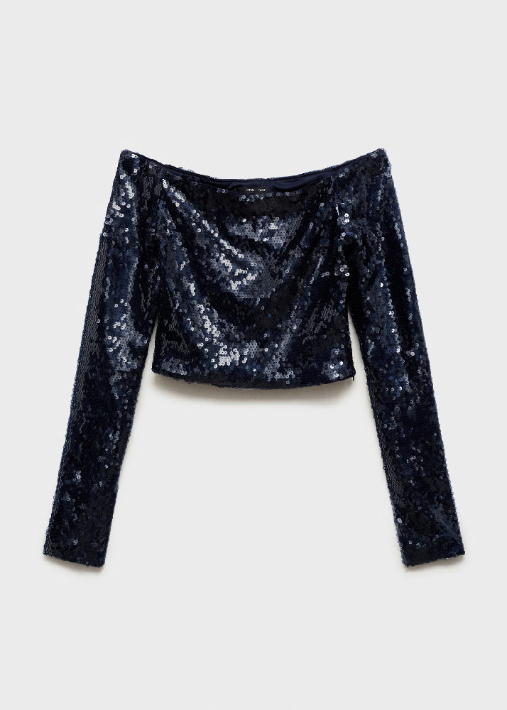 Fabric with sequin. Fitted design. Crop design. Off-shoulder design. Off shoulders. Long sleeves. Side zip closure. Total look. Party and Ceremony Collection. The model is 1.78 tall and is wearing a size 36.