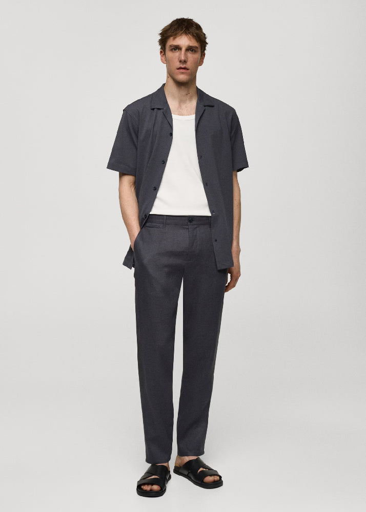 Slim fit. 100% linen fabric. Mid-rise. Belt loops. Front fastening with double-breasted buttons and zip. Two front pockets. Coin pocket at hip height. Two welt pockets with button at the back. Standard design. Antoine Griezmann Campaign. The beige colour is an online exclusive. Two-coin pockets.