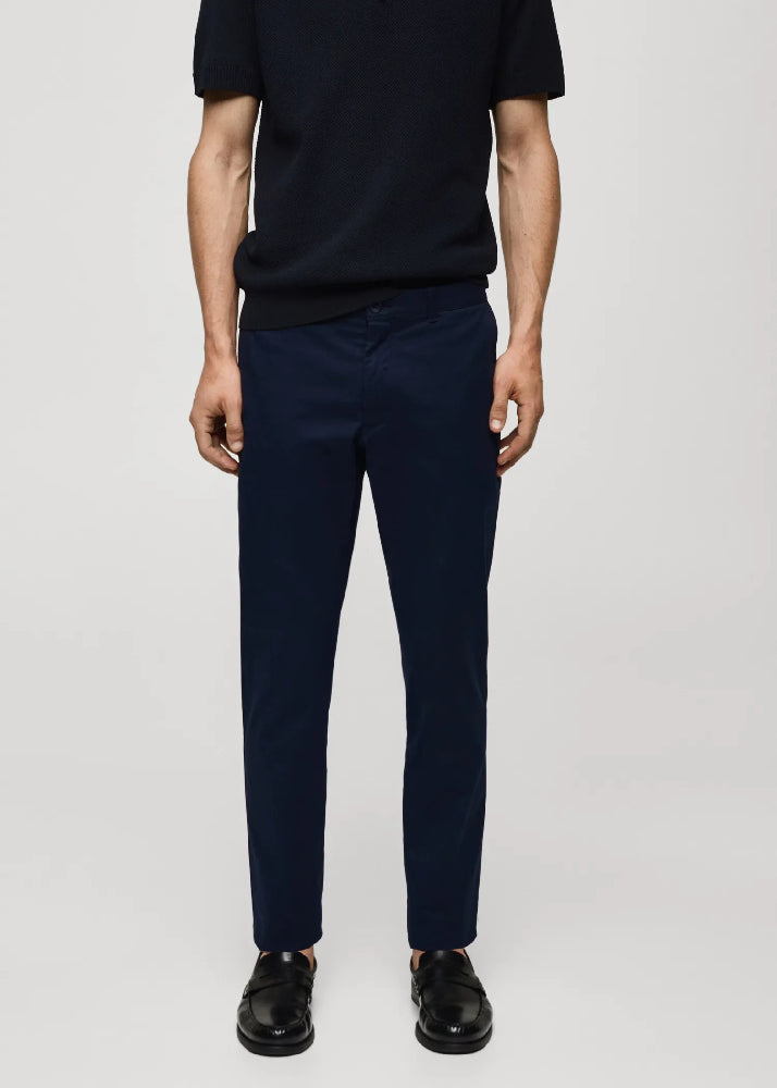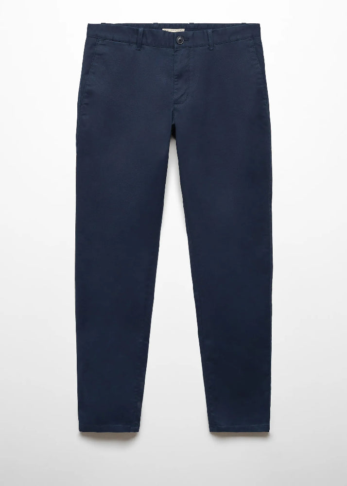 Slim fit. Cotton elastic. Belt loops. Zip and button fastening. Five pockets. Two side pockets. Coin pocket. Two welt pockets at the back.