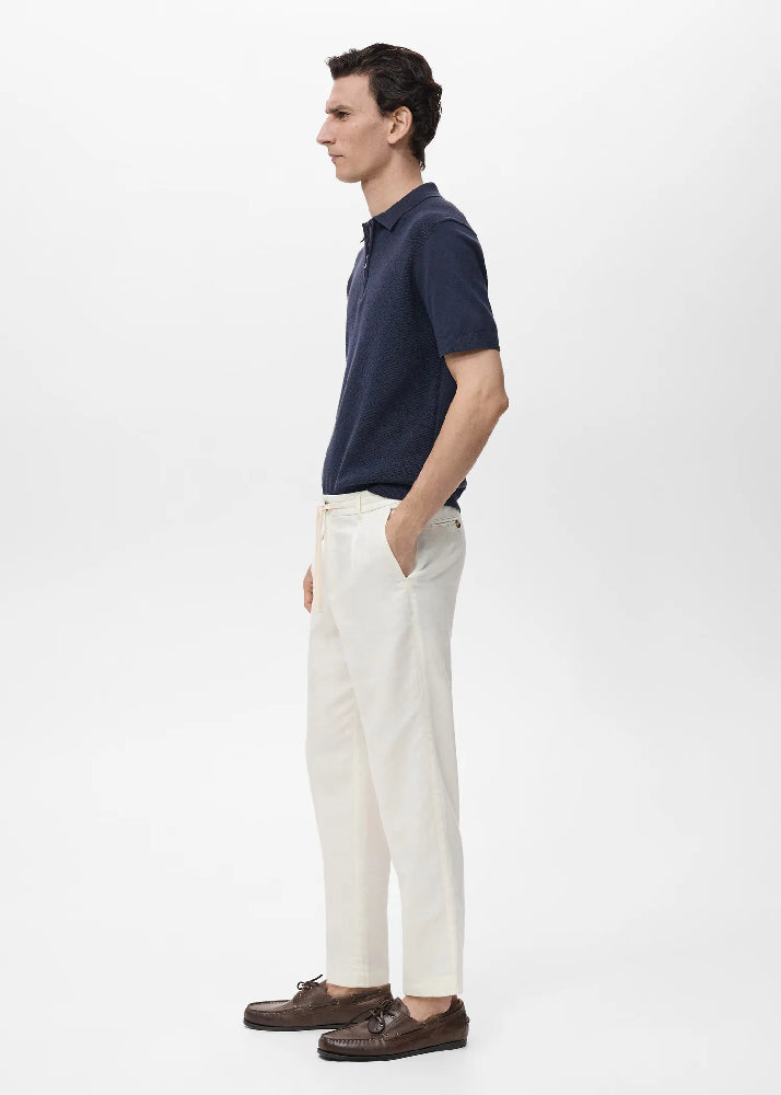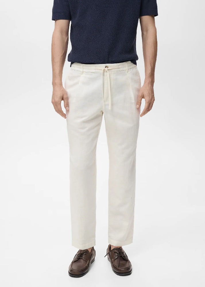 Cotton and linen blend fabric. Slim silhouette. Elastic waist with adjustable drawstring. Lanyard with option of visible or hidden knot on the inside. Belt loops. Front fastening with double-breasted buttons and zip. Darts on the front. Two front pockets