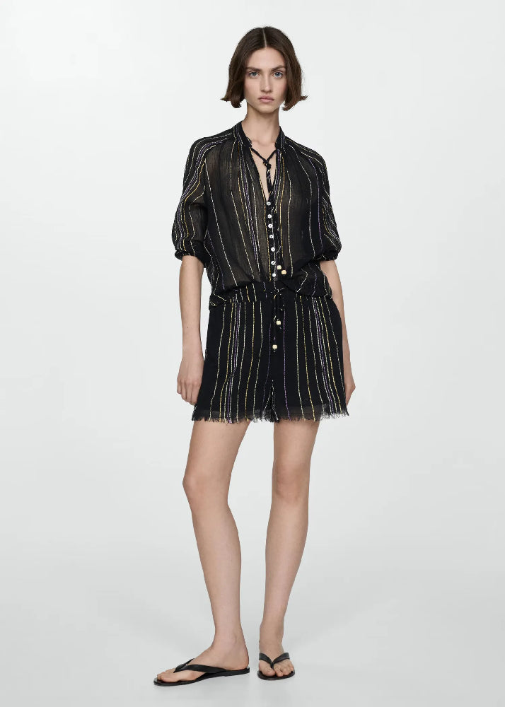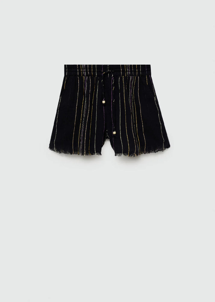 Cotton blend fabric. Short design. Straight Design. Elastic waist with tie closure. Frayed hem. Total look. Striped design
