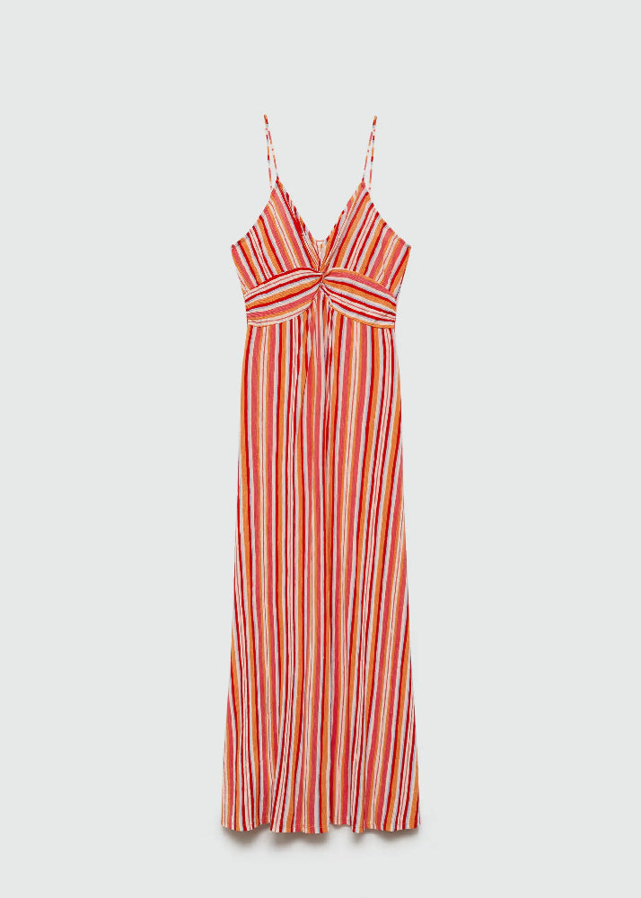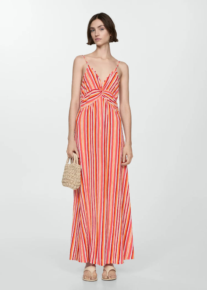 Fluid fabric. Long design. Straight Design. Striped print. V-neckline. V-neckline in the back. Sleeveless. Wide straps.