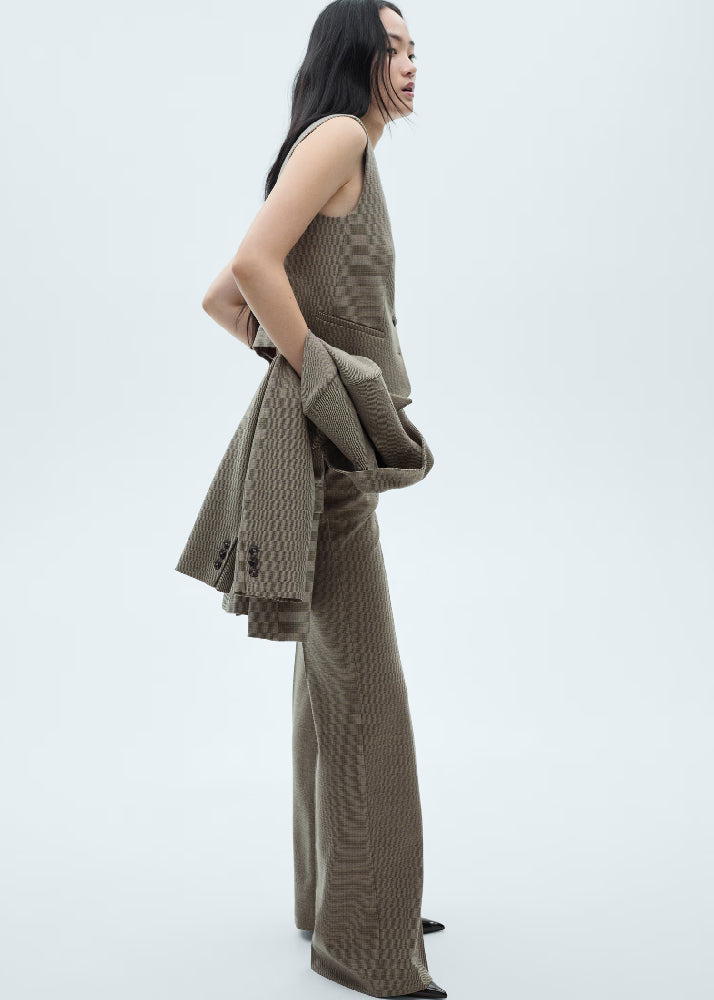 Suit style. Flare design. Long design. Bell design. Checked print. Two side pockets. Medium waist. Belt loops. Concealed button, hook and zip fastening. Total look.
