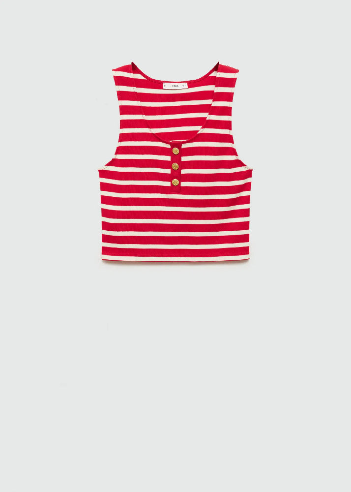 Straight design. Striped print. Round neck. Sleeveless. Wide straps. Decorative buttons. 100% cotton fabric. Fitted design