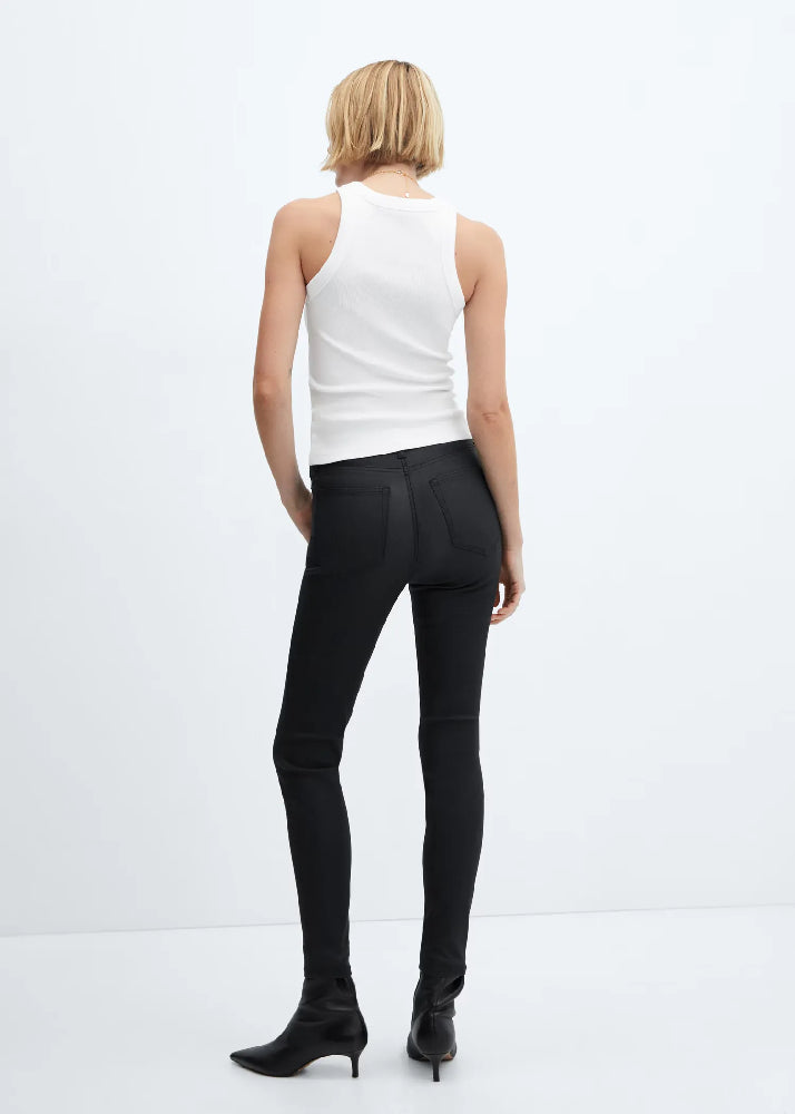 Elastic fabric. Waxed. Long design. Skinny fit. High waist. Belt loops. Five pockets