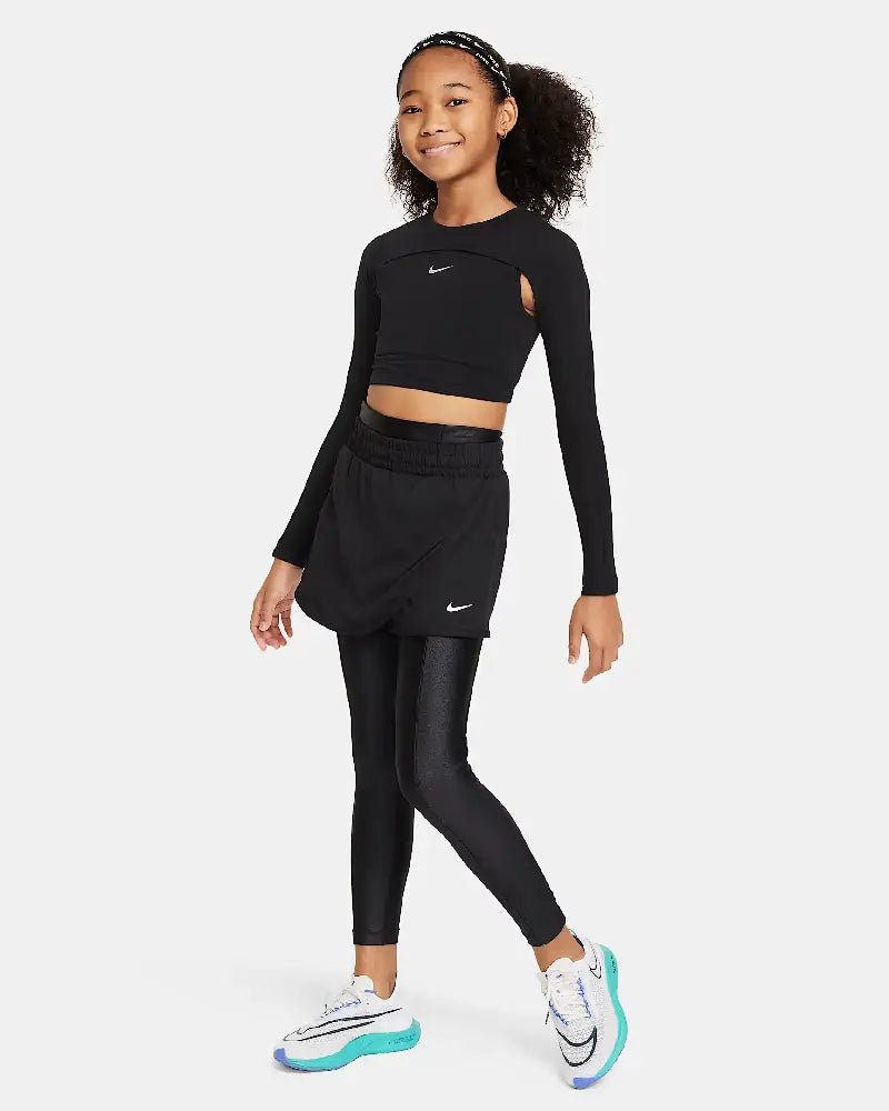 Kind of like an ice cream sandwich, this Nike Skort turns two great things into one really awesome thing. Draped fabric in the front gives these soft shorts the look of a skirt, so you get style and comfort in one. Plus, their lightweight fabric pulls sweat away from your skin to help you stay cool and dry as you play.
