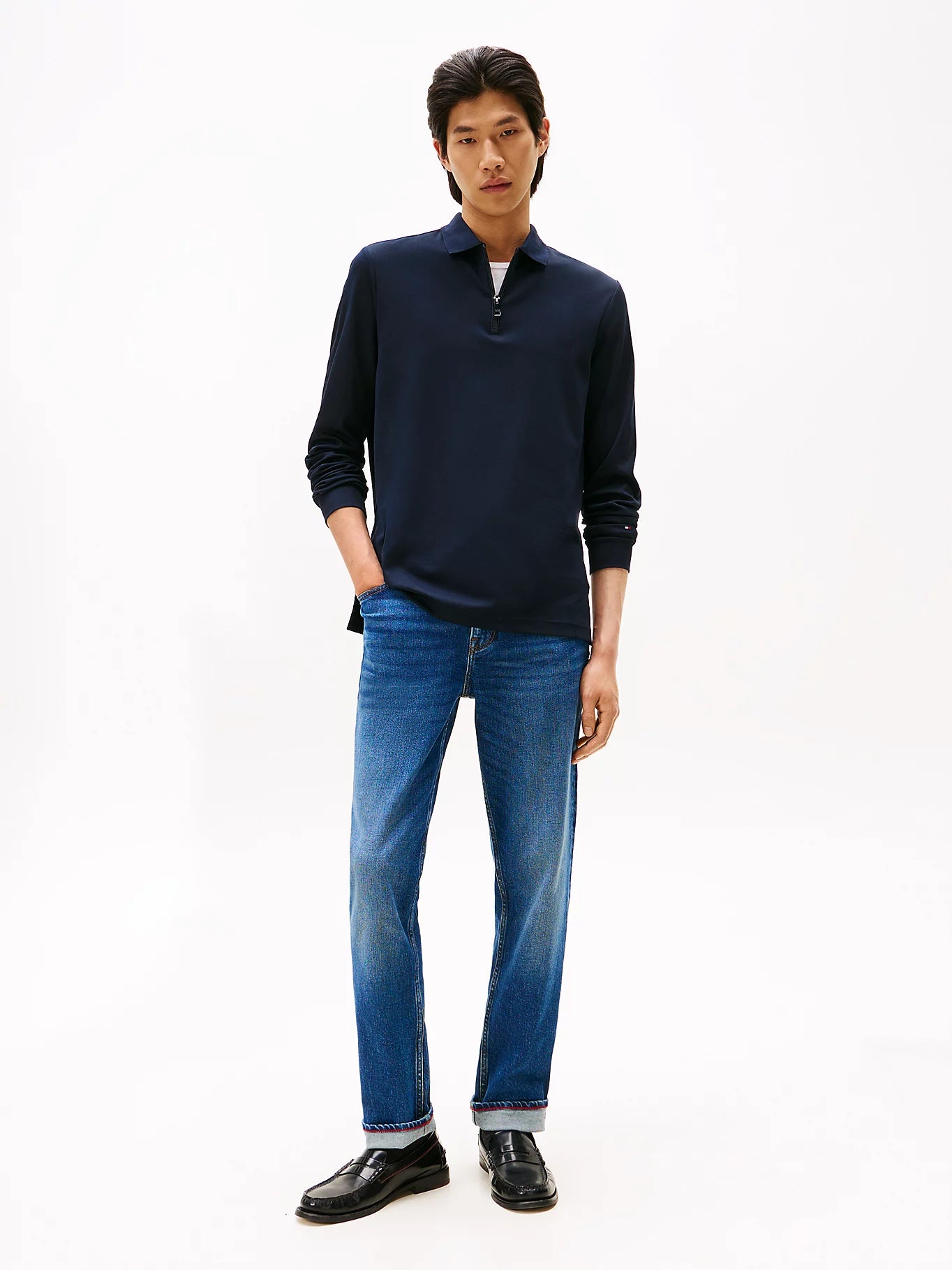 Simple styling and a zipped neckline bring sophistication to this long-sleeve polo shirt, made from pure cotton with a luxuriously soft handfeel.