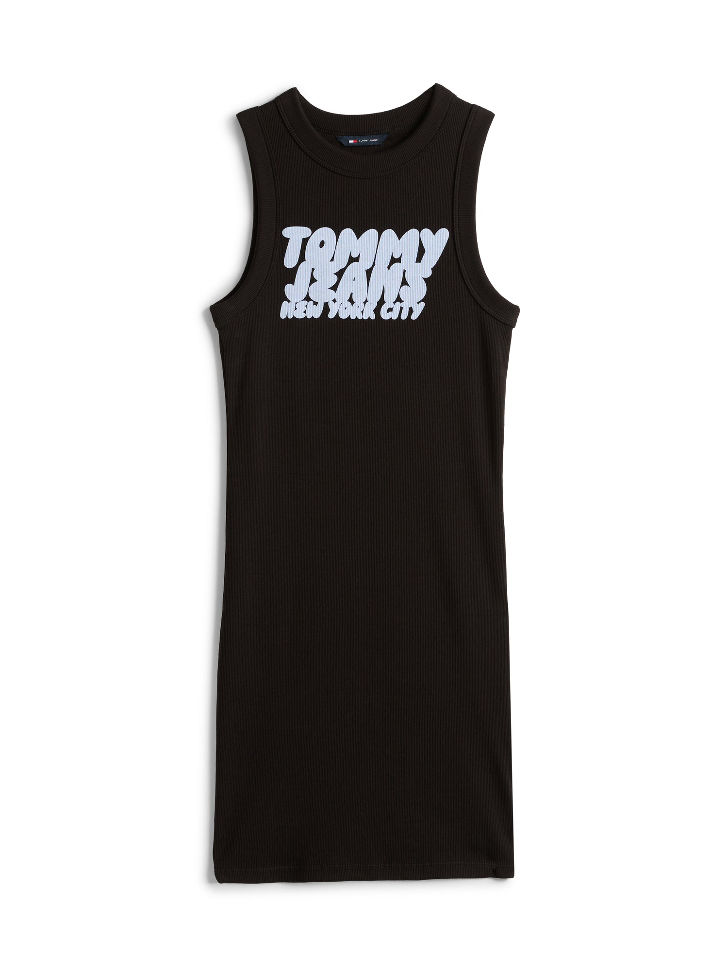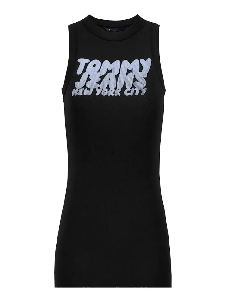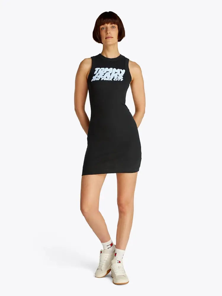 This slim-fitting bodycon mini dress combines a crew-neck tank top with a bold bubble logo for a striking look.