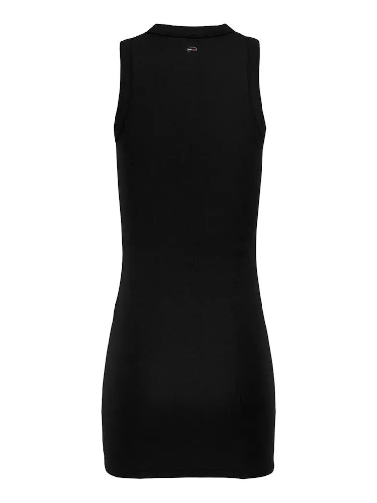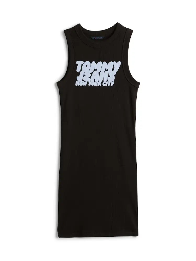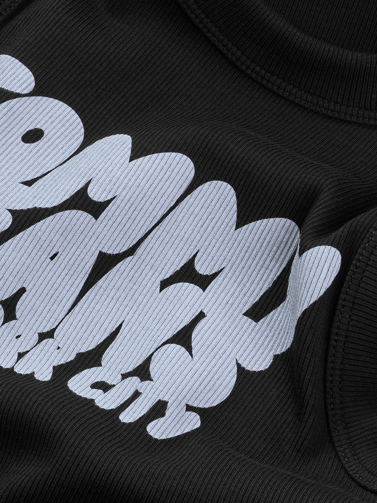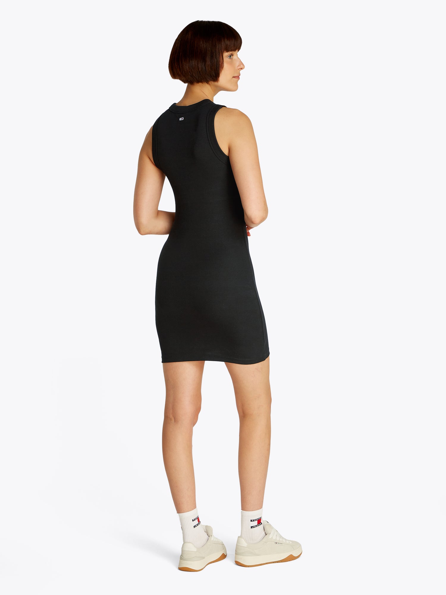 This slim-fitting bodycon mini dress combines a crew-neck tank top with a bold bubble logo for a striking look.
